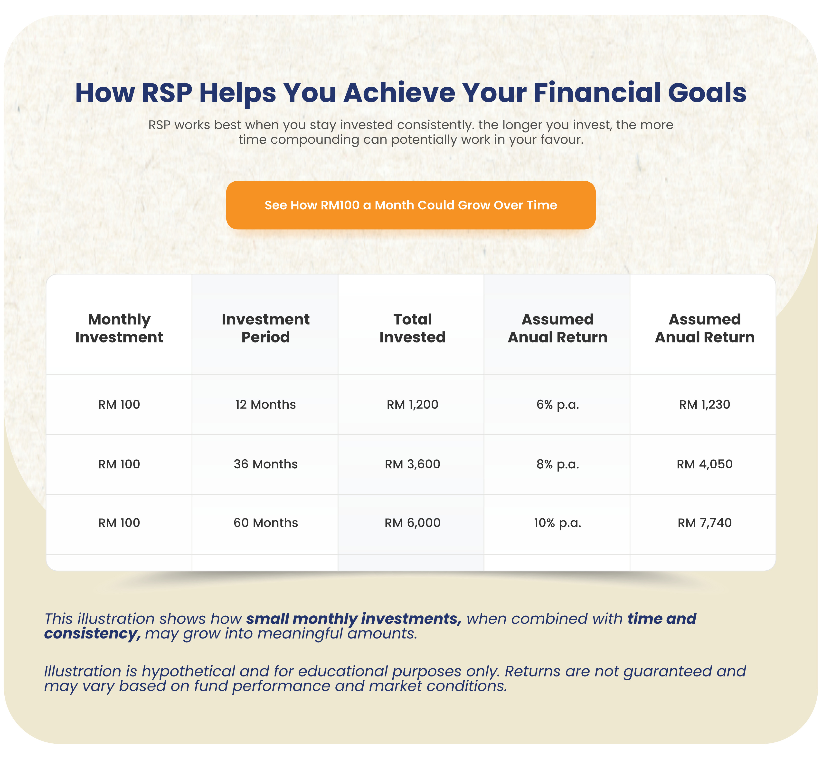 With RSP, you can invest from as low as RM100 per month, set up